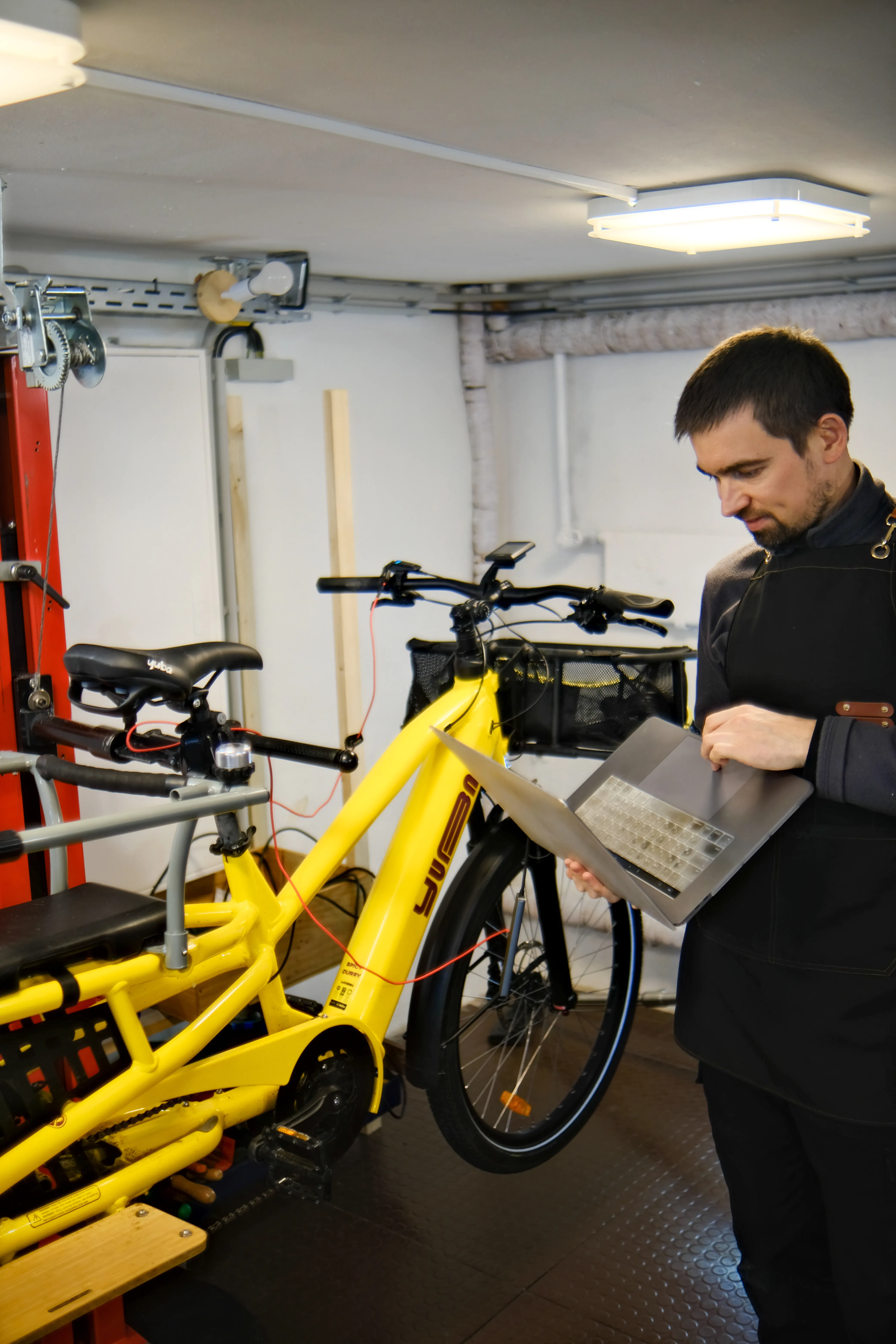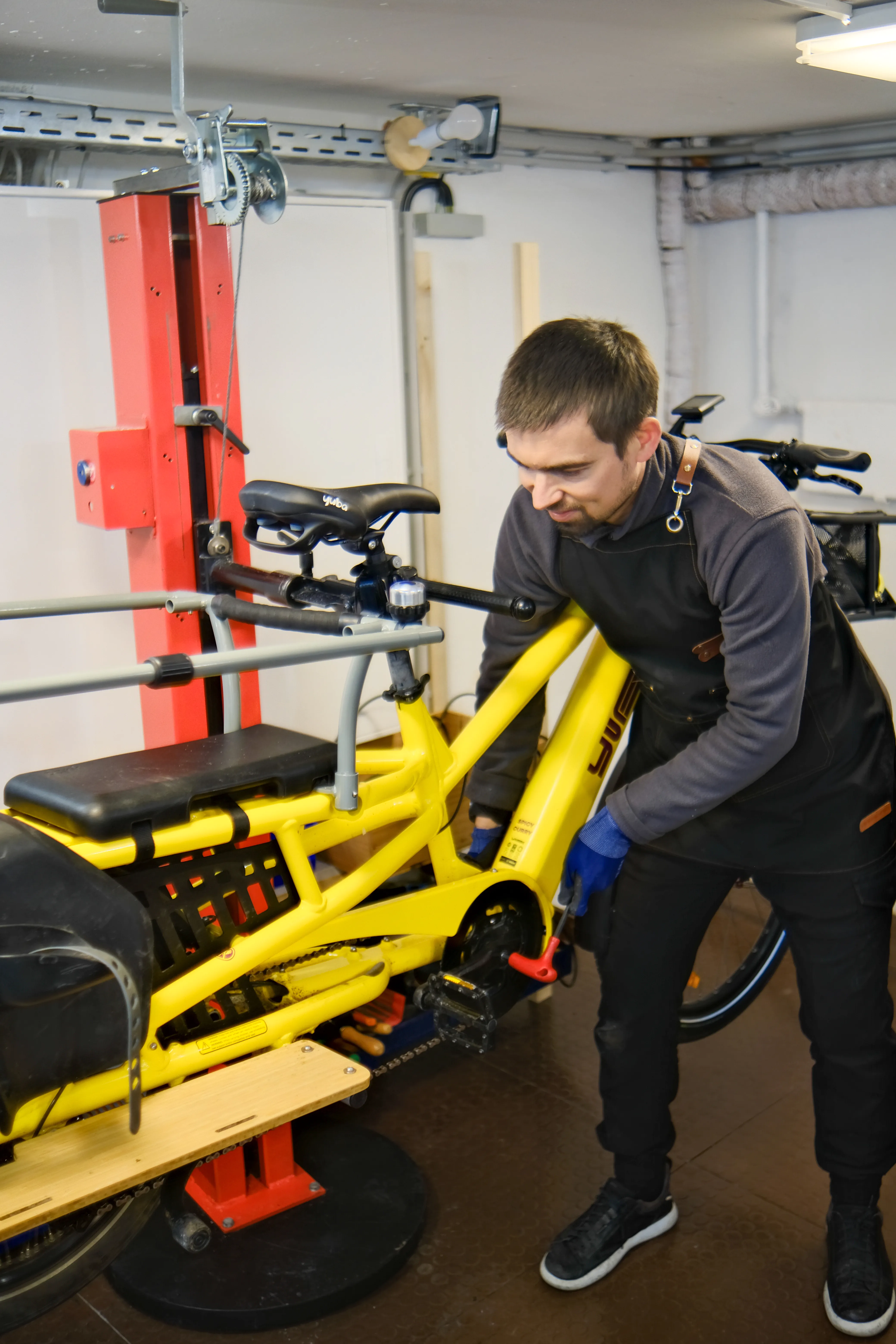📸 Foto 1: Das E-Lastenrad hängt sicher auf unserer Montagestütze während der Inspektion.